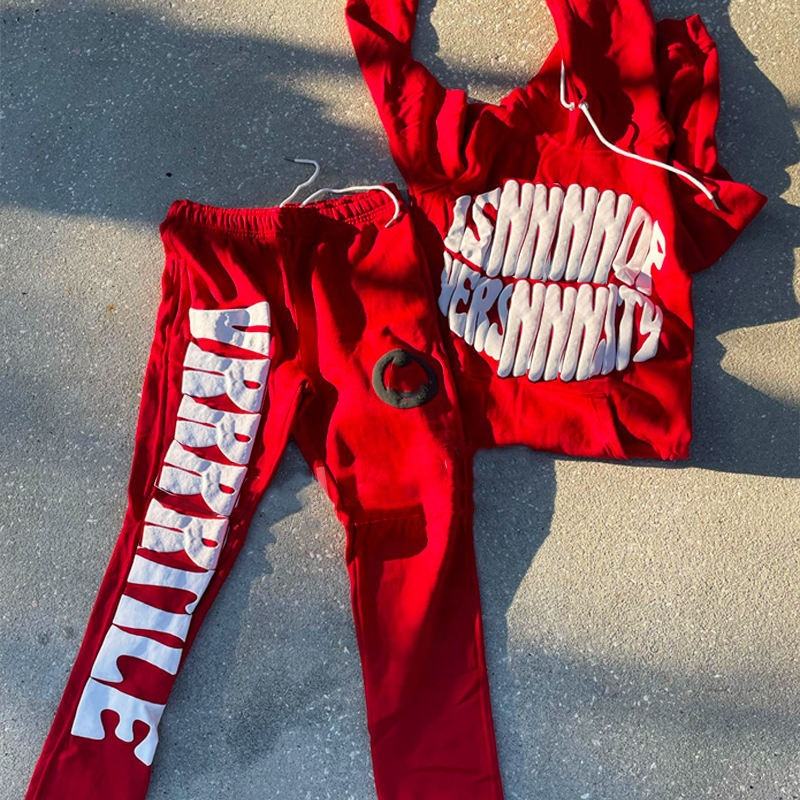 Survêtement unisexe personnalisé avec impression en relief, style streetwear, comprenant un sweat à capuche court à ourlet brut et un pantalon de survêtement évasé pour homme