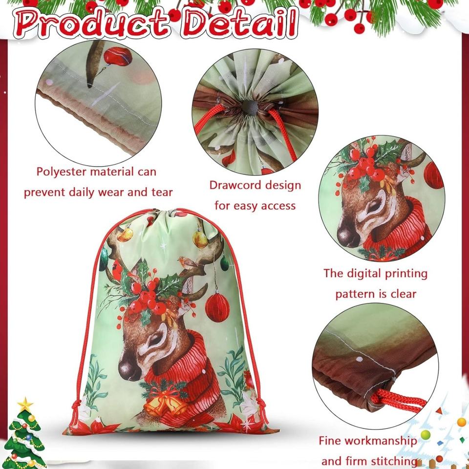 Sac à cordon personnalisé rouge en non-tissé avec motif sapin de Noël et flocons de neige pour cadeaux et friandises du Père Noël