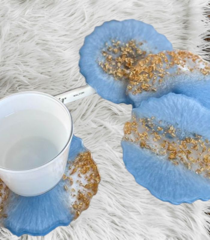 Sous-verre en résine personnalisé pour boissons, usage domestique ou mariage, couleur bleu ciel, design paillettes dorées, anneau de serviette rond en résine motif fleur