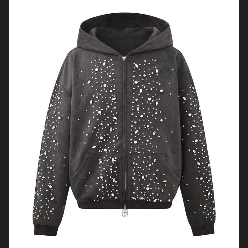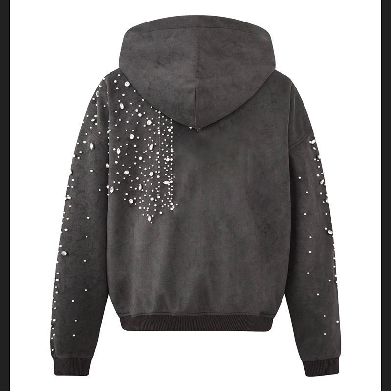 Sweat à capuche personnalisé en strass, streetwear unisexe, surdimensionné, zippé, en daim, avec strass et perles, pour homme