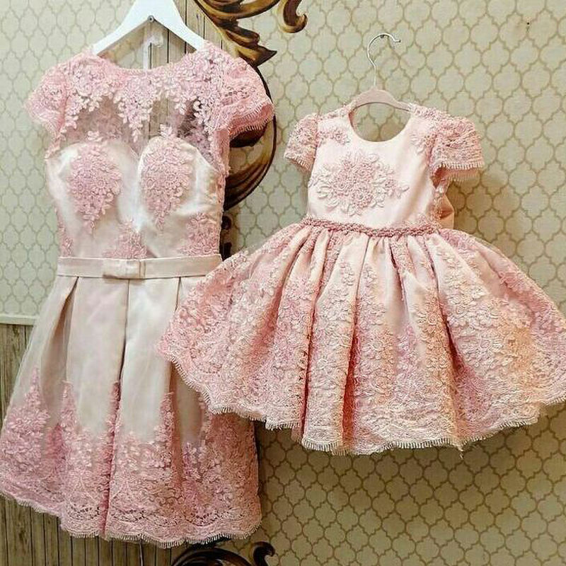 Robe de cérémonie personnalisée pour enfants, entièrement en dentelle, avec manches courtes et broderies, pour petites filles