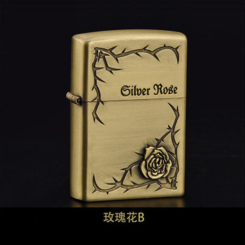 Personnalisé Rose Motif Exquis Moderne Style Classique Kérosène Coupe-Vent Meule Cigarette Briquet À Huile En Alliage De Zinc