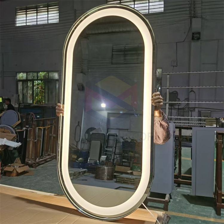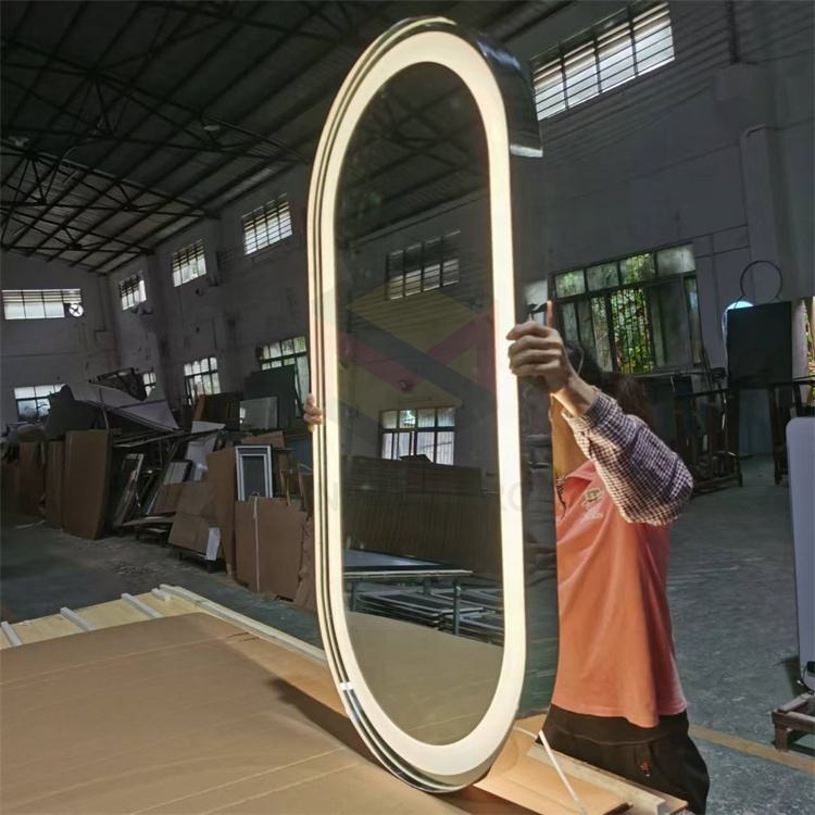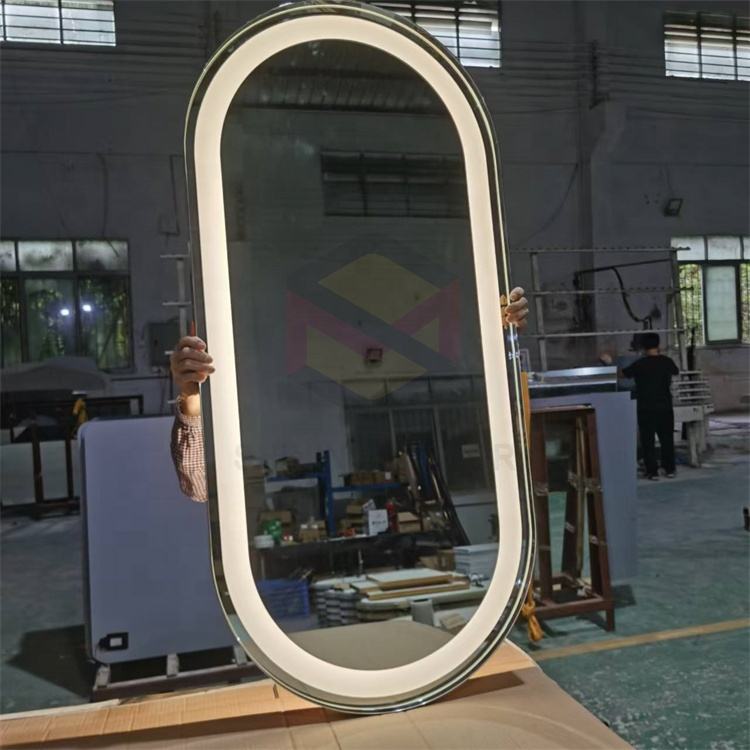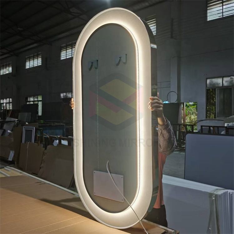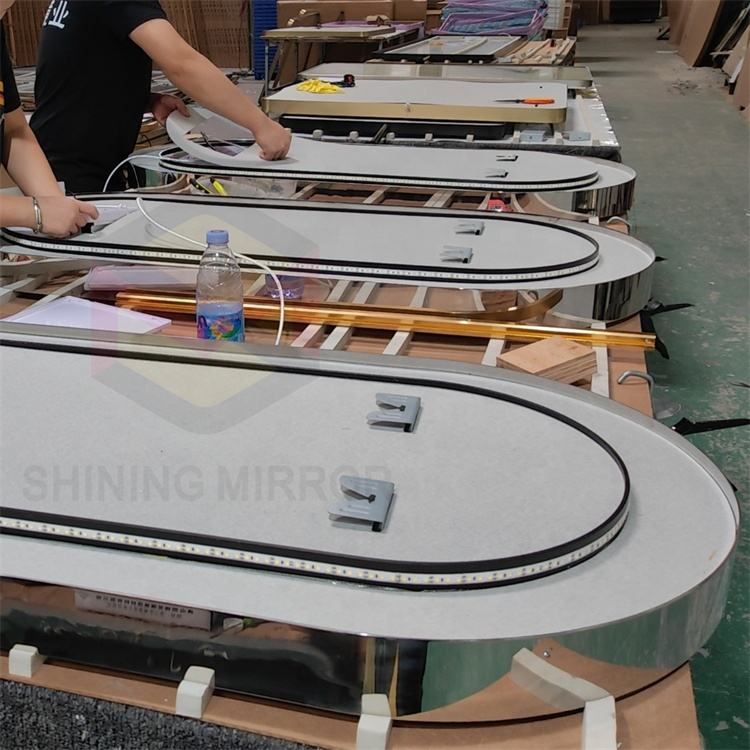 Miroir en forme de piste personnalisé 304 cadre en acier inoxydable hôtel mural avant et arrière illuminé salle de bain miroir LED