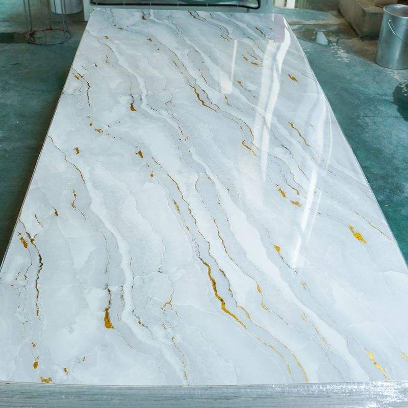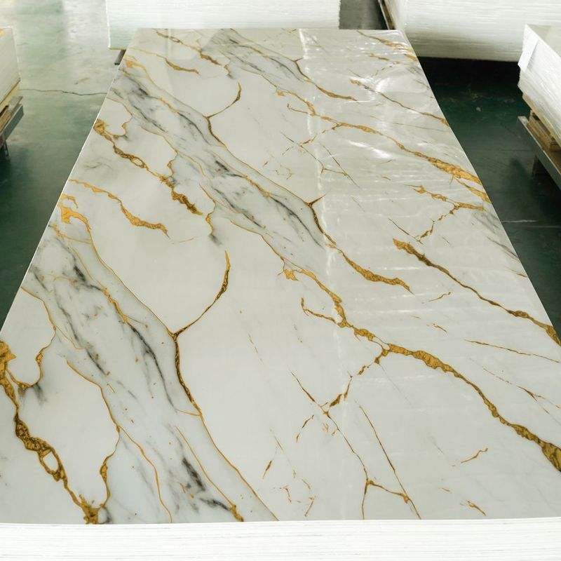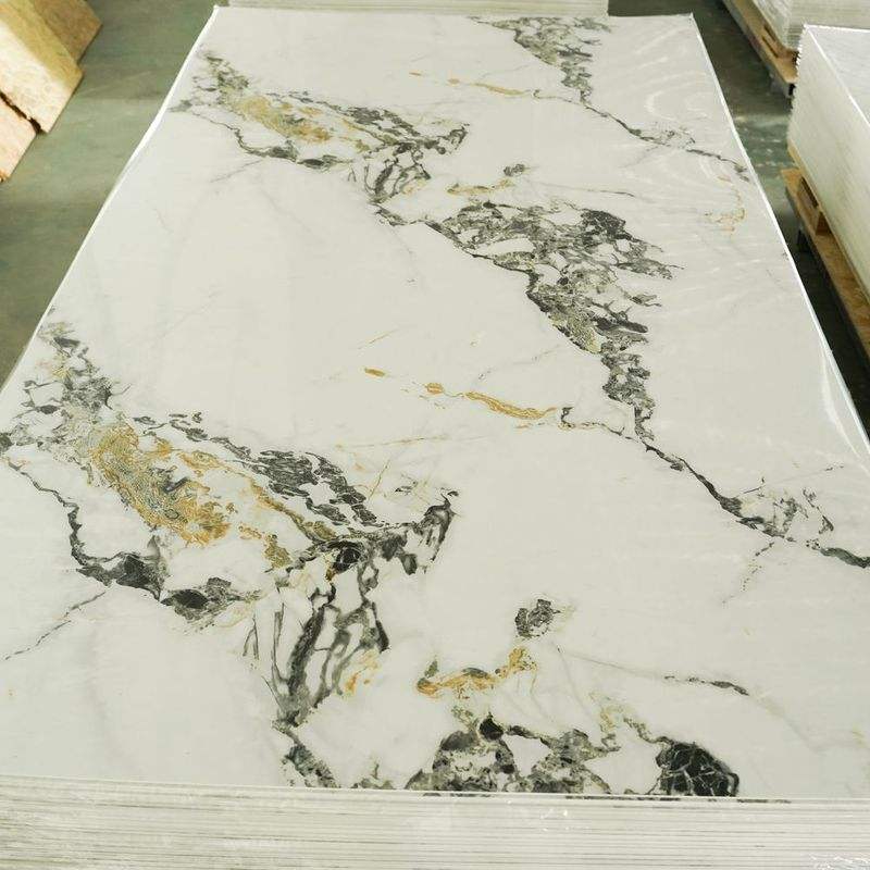 Panneau mural SPC personnalisé feuille de marbre UV brillant blanc comme neige type de marbre feuilles de PVC baguette étanche plaque de PVC