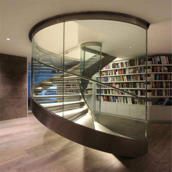 Escalier incurvé personnalisé en usine de Shenzhen-Intérieur moderne en acier de style spirale avec garde-corps en verre Bandes de roulement en bois