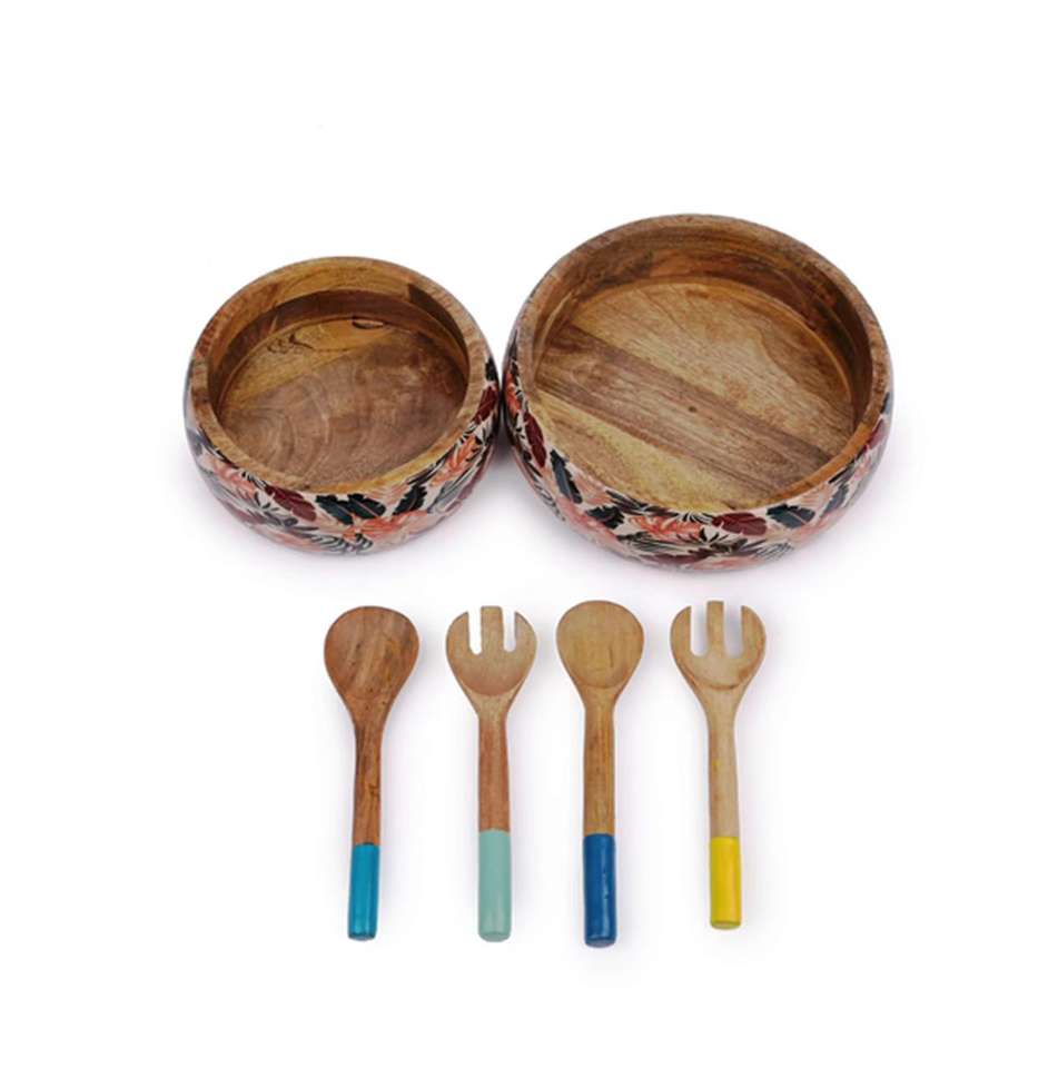 Bol de service en bois de manguier de taille personnalisée, plateau de saladier jaune imprimé le plus vendu fait à la main en Inde