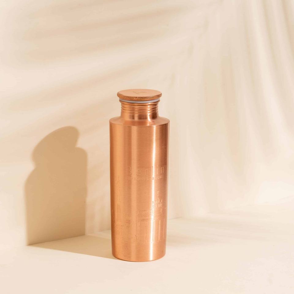 Bouteille en cuivre pur de taille et de forme personnalisées avec couvercle anti-fuite et motif gravé pour les voyages, la consommation d'eau et les fêtes
