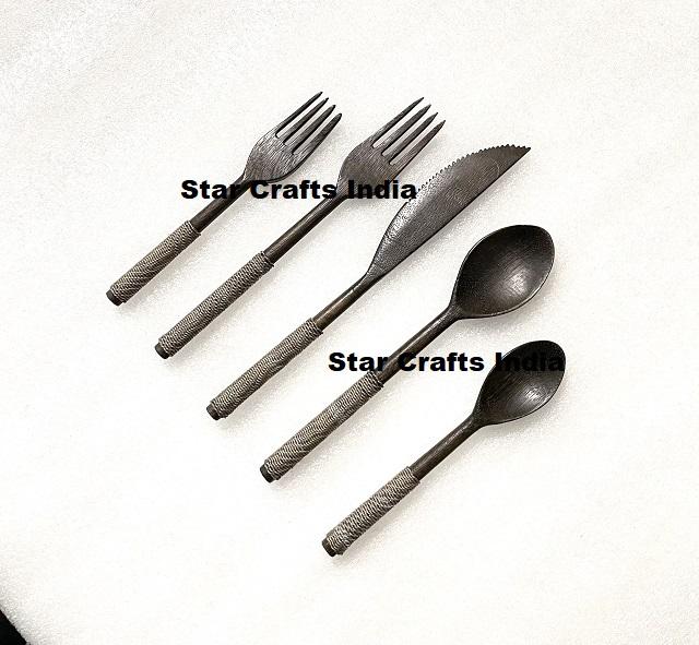 Couverts en acier inoxydable personnalisés avec poignée en osier multicolore service de vaisselle 5 pièces couverts tissés à la main poignée en rotin vaisselle