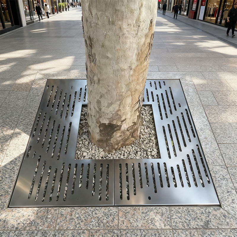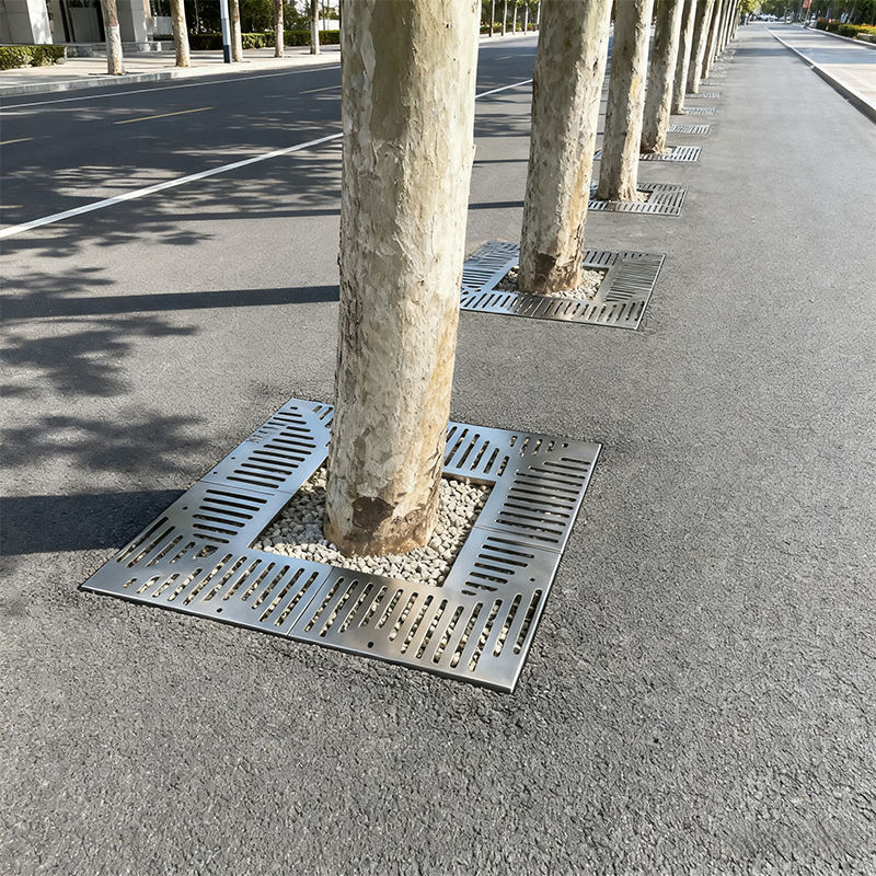 Grille d'arbre en acier inoxydable sur mesure pour un arrosage et un drainage faciles, grille d'arbre en acier métallique pour le sol des parcs