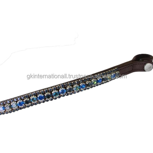 Chaîne métallique personnalisée à trois rangées de cristaux bleus bande de front de cheval en cuir incurvé décoratif pour bride fabricant de gros