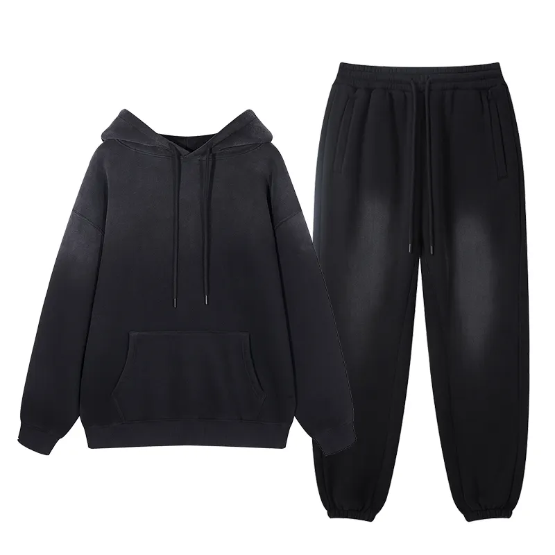 Customized Two-Piece Acid Wash Fleece Streetwear Hooded Solid Tracksuit Women Men Winter Lightweight Windproof Logo Front Plus