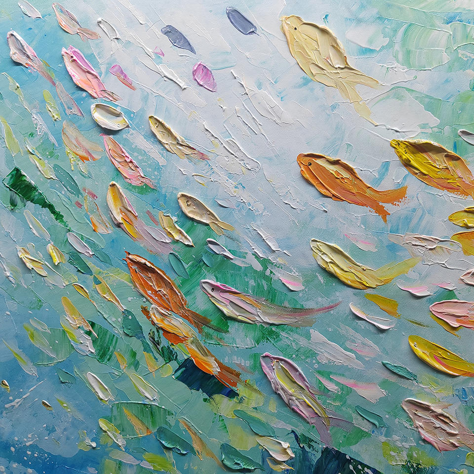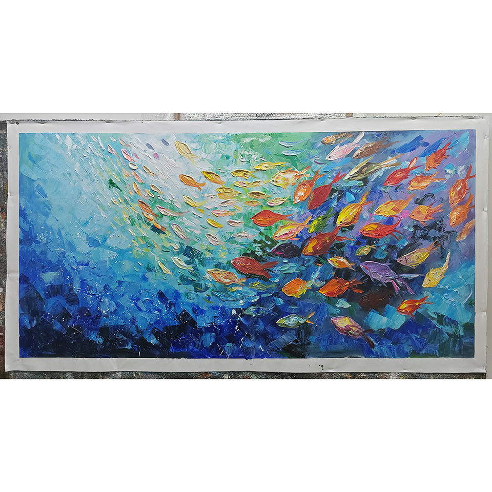 Personnalisé en gros fait à la main Style dessin animé écologique grande toile oeuvre couteau école de poisson peinture à l'huile Art mural