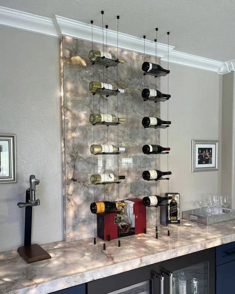 Étagère à vin personnalisée porte-bouteille casier à vin suspendu câble métallique flottant système de câble de vin avec verre propre et clip ruban