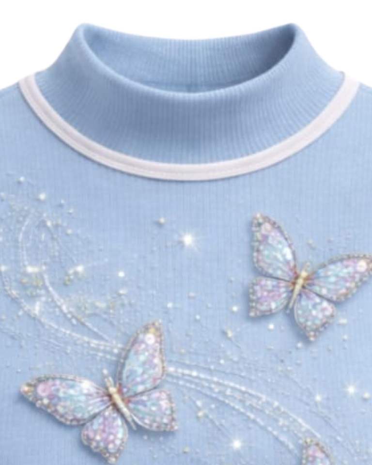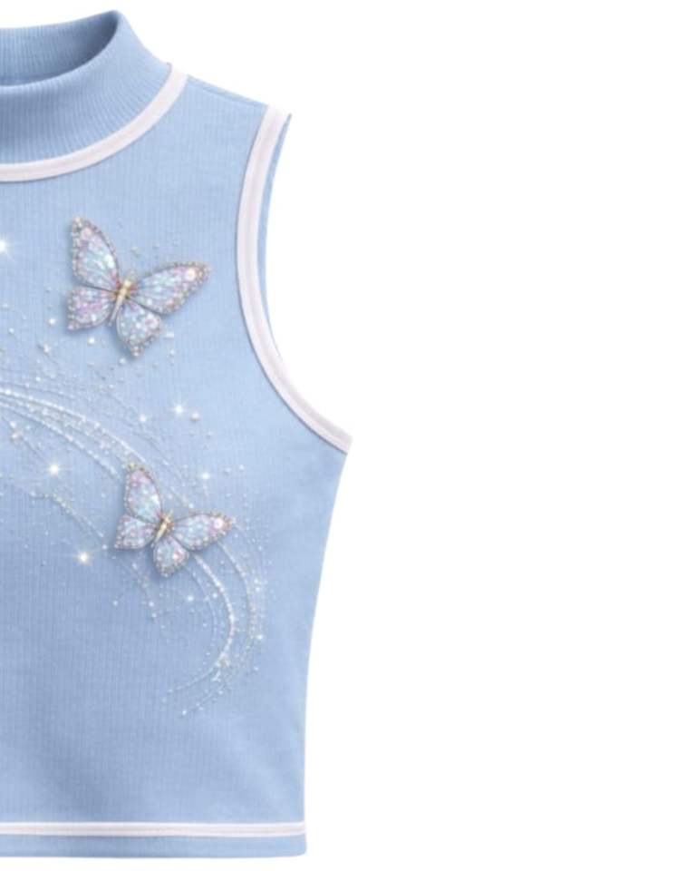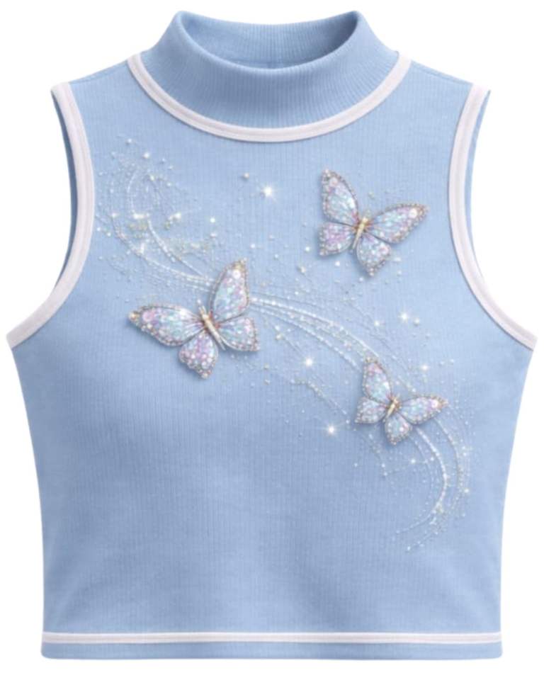 Débardeur côtelé bleu ciel personnalisé pour femme avec col montant et motif papillon en strass, sans manches, été, fabrication sur mesure
