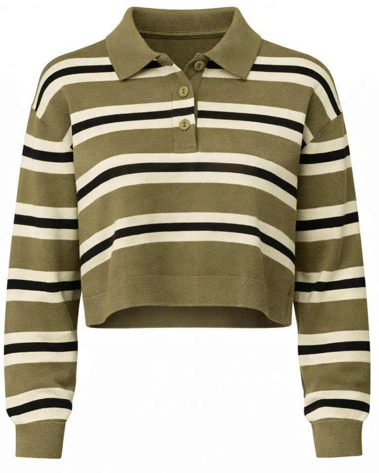 Pull Polo Court Rayé Vert Olive Personnalisé pour Femme avec Patte de Boutonnage Manches Longues Tricot Doux Décontracté Mode Hiver