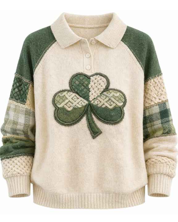 Pull en tricot à col polo personnalisé pour femmes, patchwork, vert, pull à manches longues, trèfle brodé, haut décontracté d'hiver