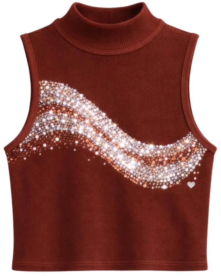 Débardeur côtelé personnalisé pour femme, marron rouille, col montant, avec motif vague en strass, sans manches, été, fabrication sur mesure