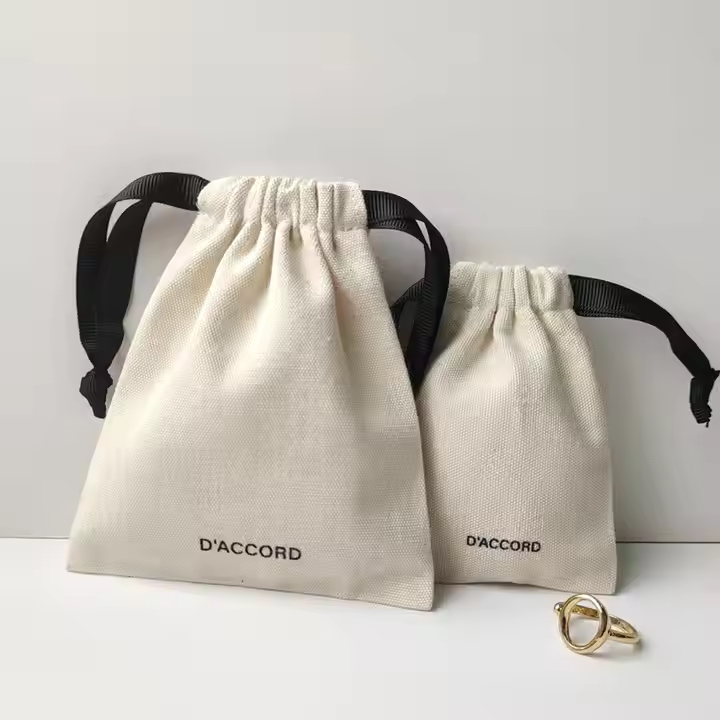 Customized logo Cream Canvas Cotton Pouch Gift Earing Necklace Jewelry Packaging Drawstring Bag
