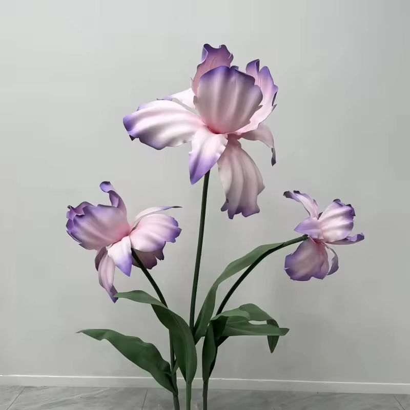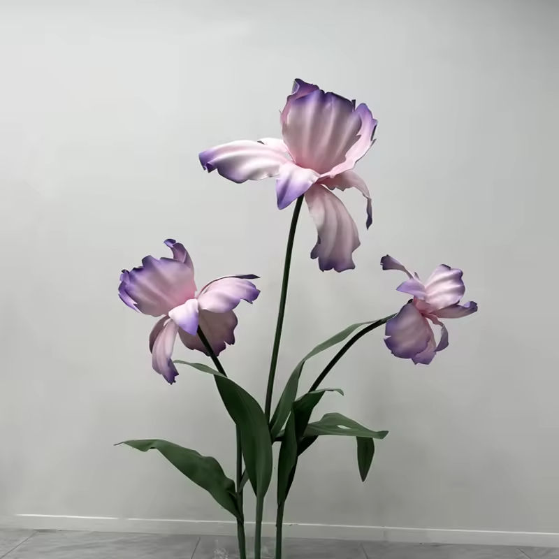 Grande fleur d'iris rose et violet personnalisée avec base et tige fleur autoportante pour décoration d'hôtel de fond de mariage