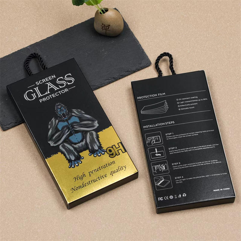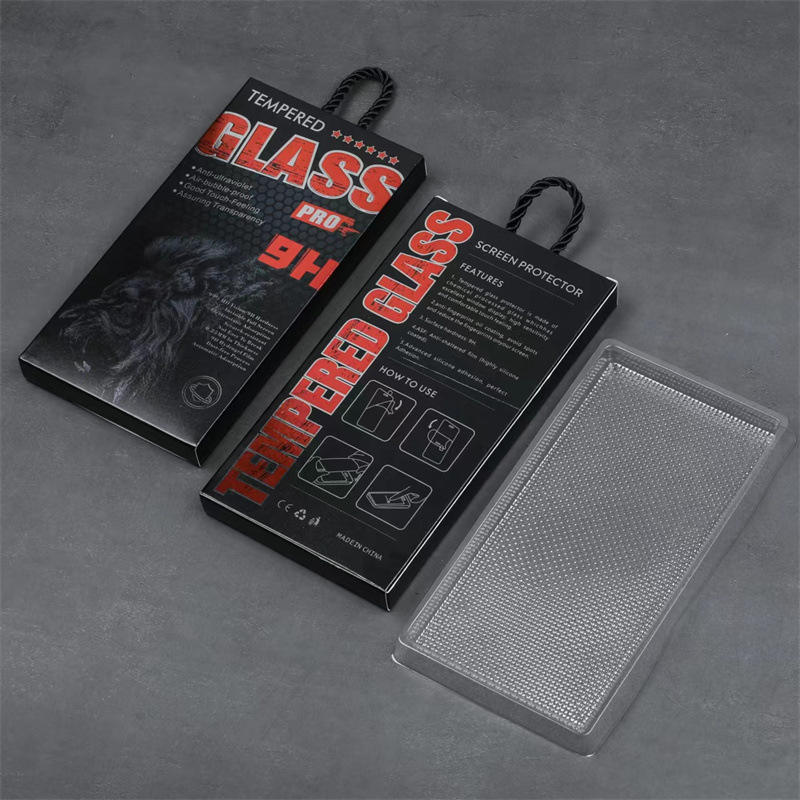 Boîte d'emballage en verre trempé personnalisée pour protecteurs d'écran de téléphone portable, équipée de différents types de crochets.
