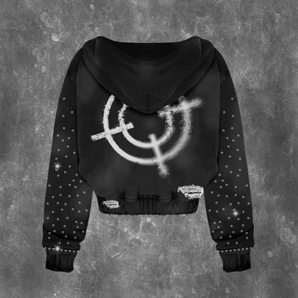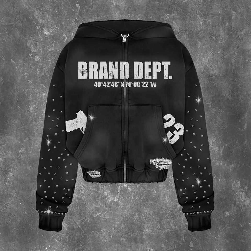 Sweat à capuche surdimensionné en coton 100% 350 g/m², lavage à l'acide, vintage, délavé, avec strass, imprimé automne, fermeture éclair