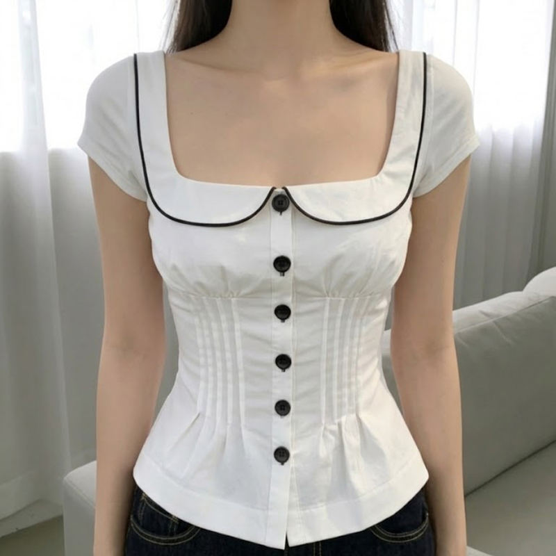 Chemise mignonne à col Peter Pan bicolore noir et blanc, taille plissée, boutonnée, manches courtes, haut d'été pour filles