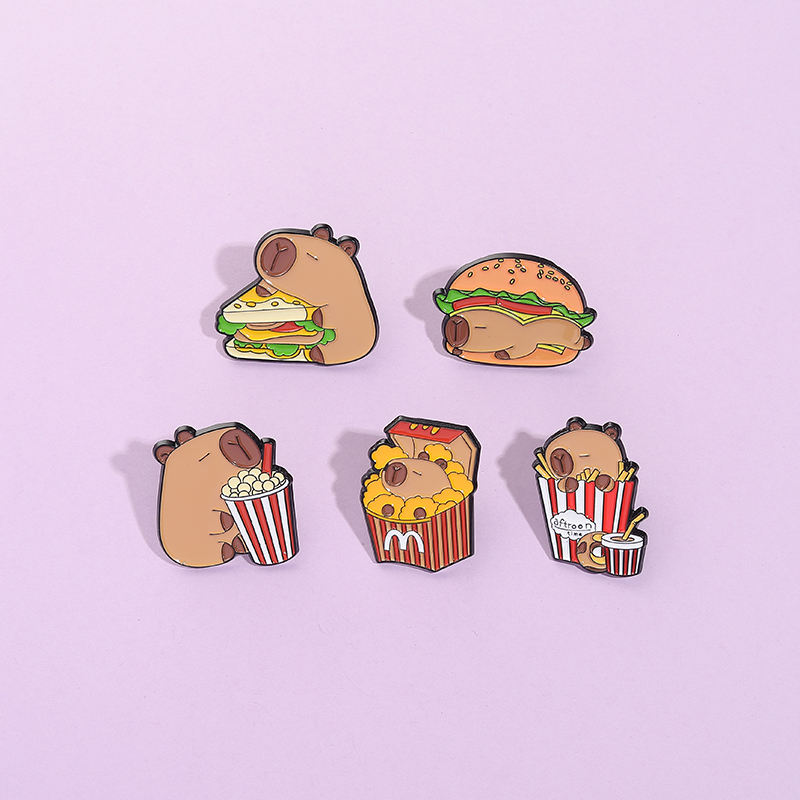 Mignon Capybara Animal émail broche dessin animé hippopotame avec Hamburger frites broches en métal revers Badge bijoux cadeau pour les amis