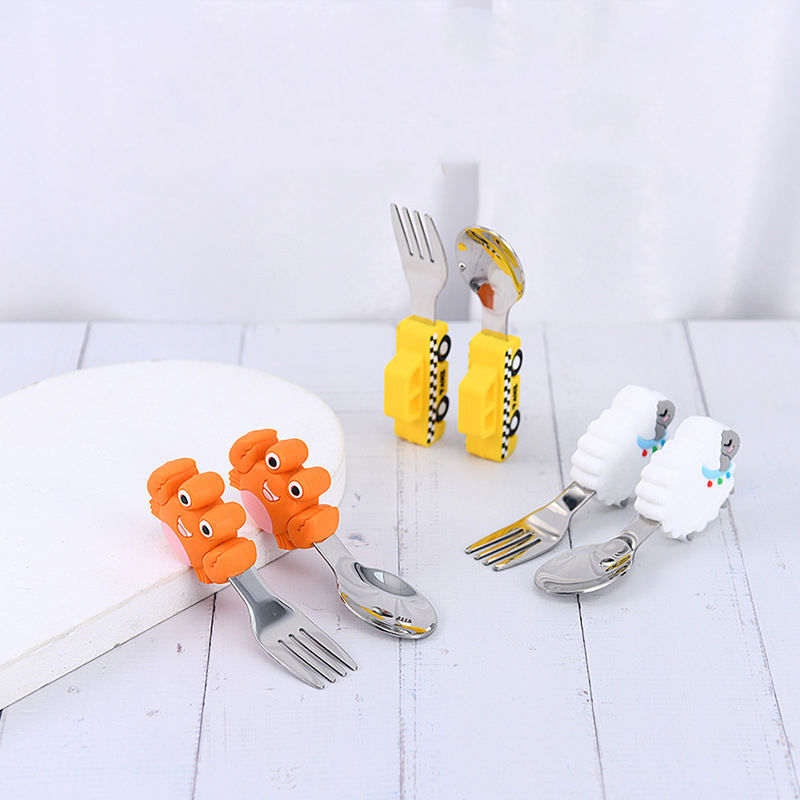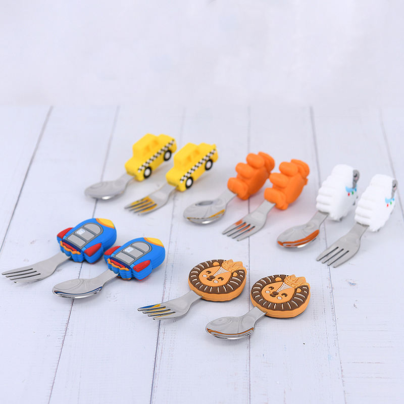 Mignon dessin animé Animal Silicone acier inoxydable bébé couverts fourchette cuillère couverts ensemble pour enfants enfants