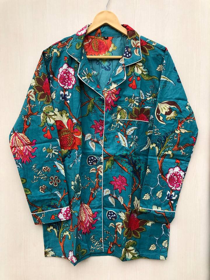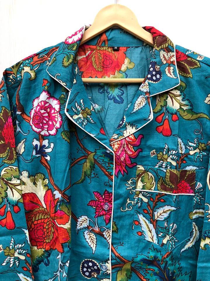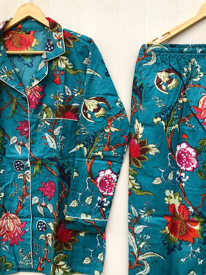Ensemble de pyjama long à manches longues pour femmes, imprimé floral personnalisé, couleur bleue, 100 % coton, confortable, prix de gros