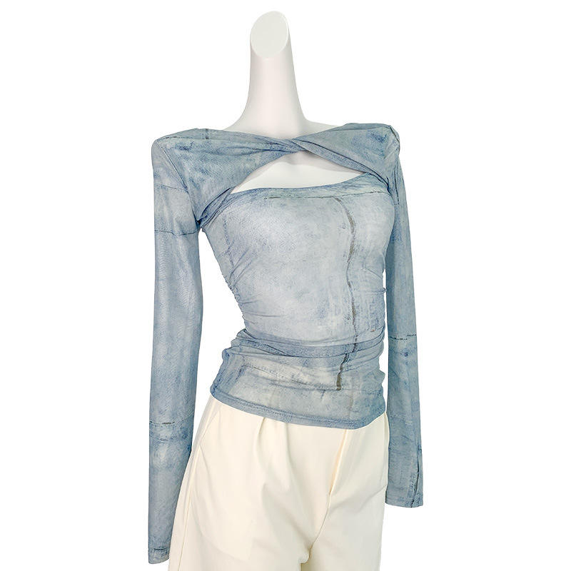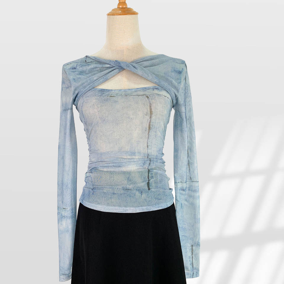 T-shirt à manches longues en maille de soie glacée mignonne, coupe ajustée, protection solaire, pour femmes, été, fin, tie-dye, nœud torsadé, haut transparent