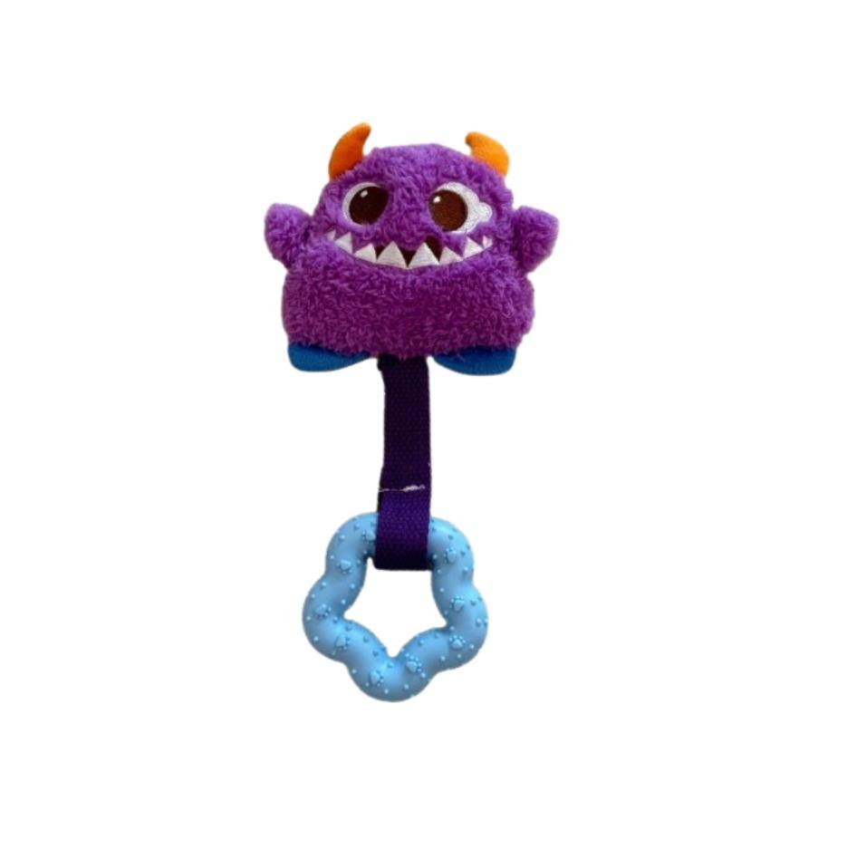 Adorable monster design with bright colors, Built-in BB squeaker for fun sound stimulation, Soft yet durable plush fabric, gentle on gums, Comes with a textured chew ring for biting, Strong strap design for tugging gamesDispositif