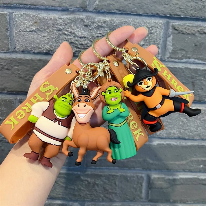 Porte-clés en caoutchouc 3D mignon Shrek, chat portant des bottes, monstre de dessin animé, pendentif, petit bijou exquis, cadeau avec sac pour les couples