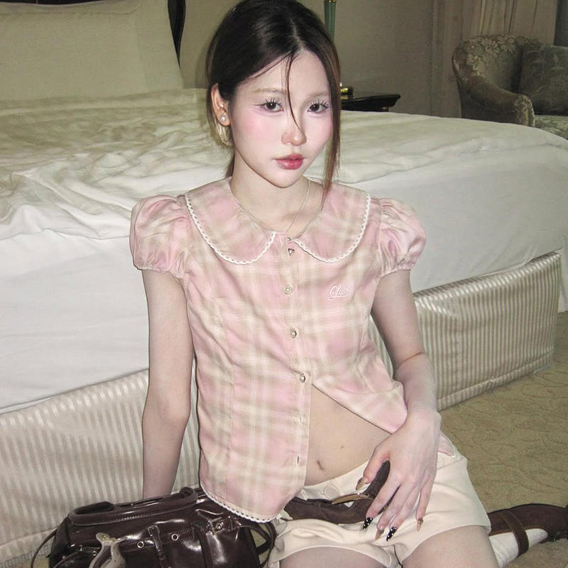 Chemise à manches courtes de style simple et mignon - Couleur unie, manches bouffantes, tissu respirant en élasthanne/polyester, printemps/été