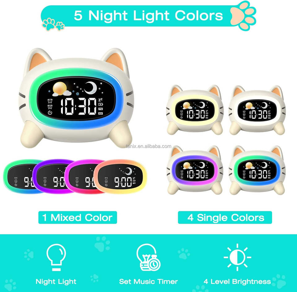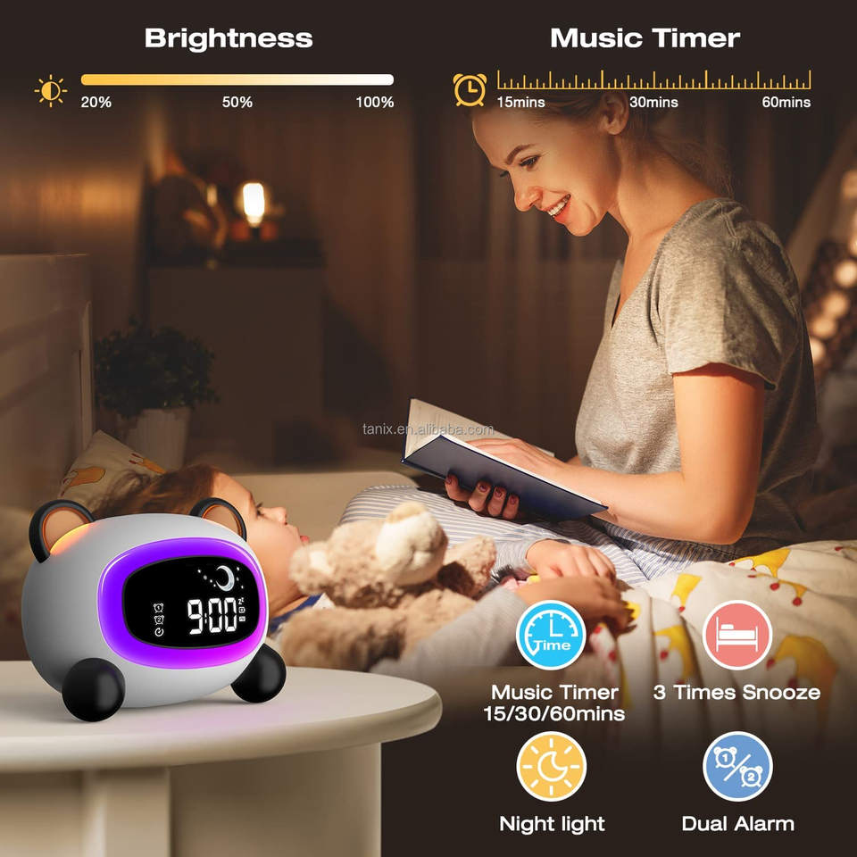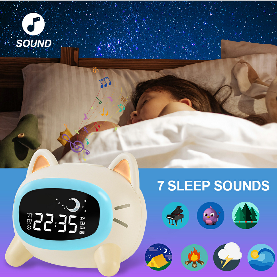 Réveil de chevet avec machine à sons apaisants, veilleuse d'entraînement au sommeil et double alarme pour enfants (filles et garçons)