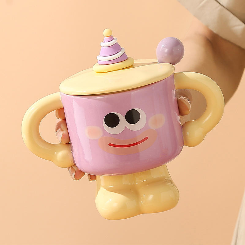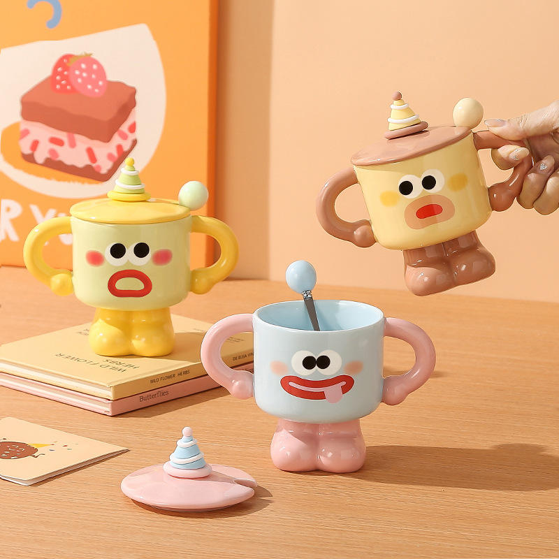 Jolies tasses à café en céramique à deux poignées, avec couvercle et cuillère, motif dessin animé