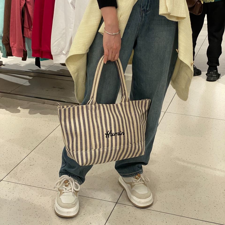 Mignon XL taille 18 pouces à rayures verticales mariage fermeture éclair sacs fourre-tout résistant à l'eau été plage toile sac broderie étiquettes doux