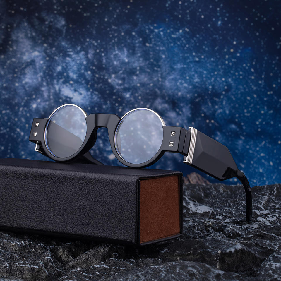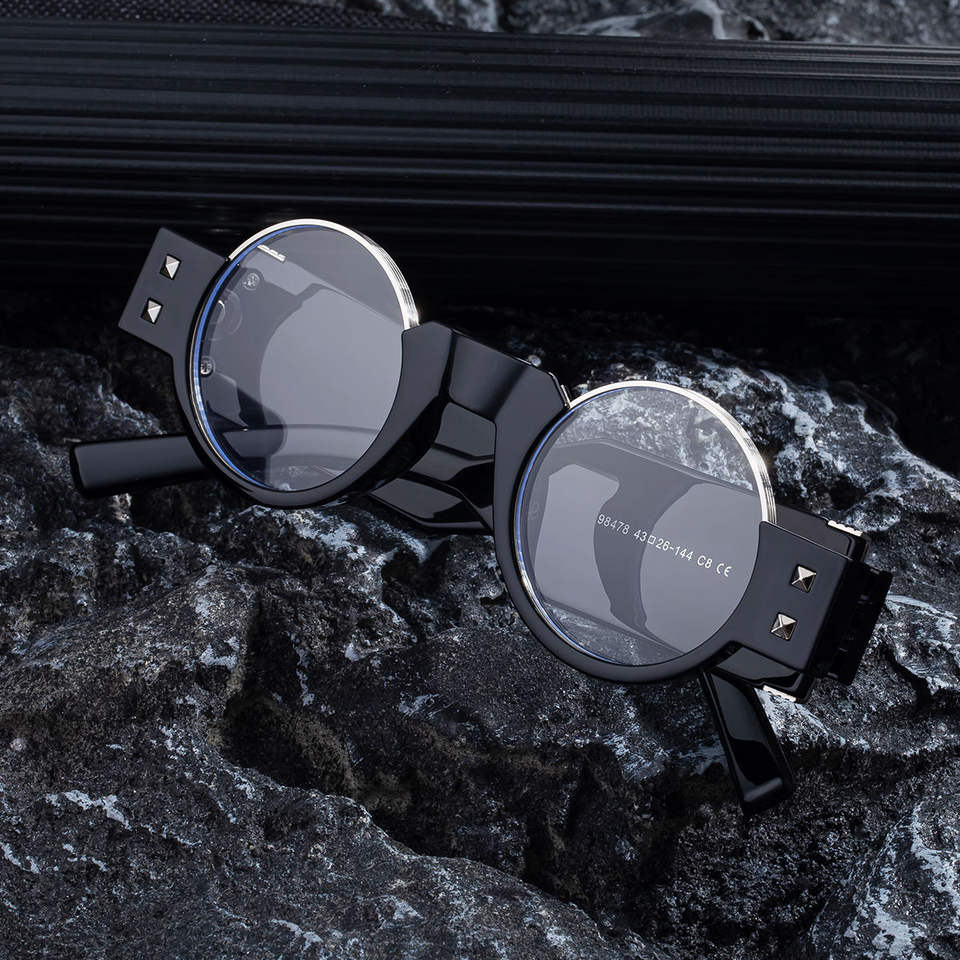 Lunettes de soleil Cyberpunk à monture ronde pour hommes, noires, UV400, verres PC, monture en plastique et métal, style punk rétro, avec boîte