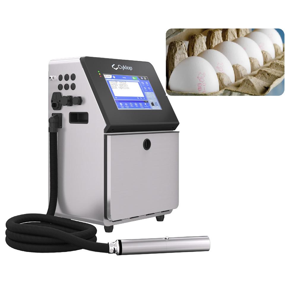 Imprimante jet d'encre CIJ Cyklop CM750 pour codage de dates sur coquilles d'œufs avec application de traversée et impression alternative pour produits en plateau