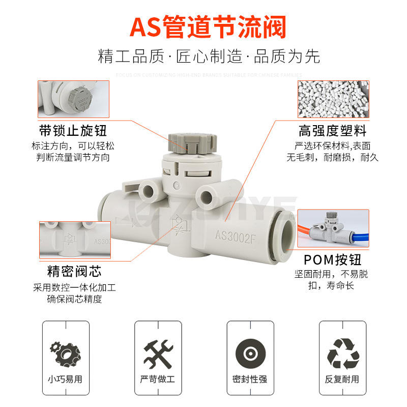 Vanne de régulation de vitesse pneumatique AS1201F M5 04A pour tuyau d'air, connecteur de tuyau d'air, vanne de contrôle de vitesse 1/4 po pour gaz à température normale