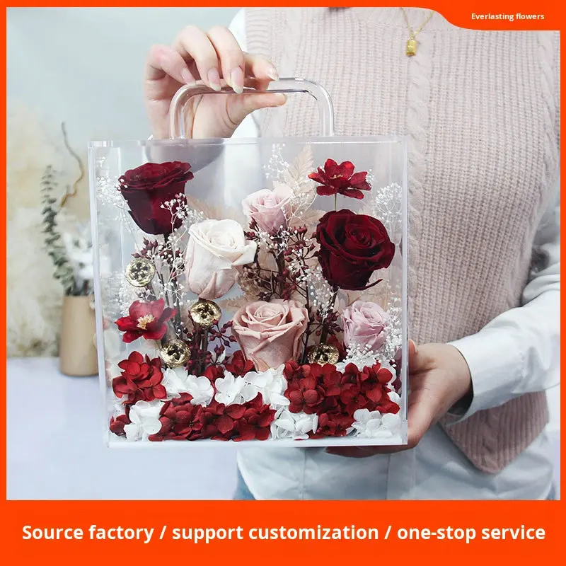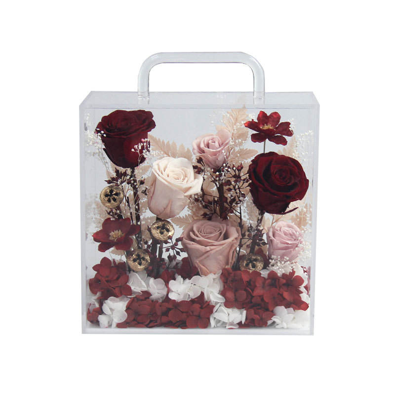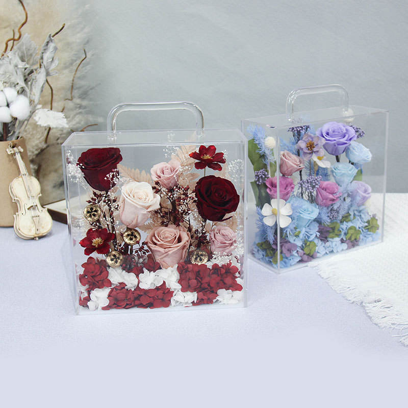 D411 Fleurs séchées multi-occasions, fleurs éternelles, boîte à fleurs carrée à main, boîte cadeau en PVC transparent fini
