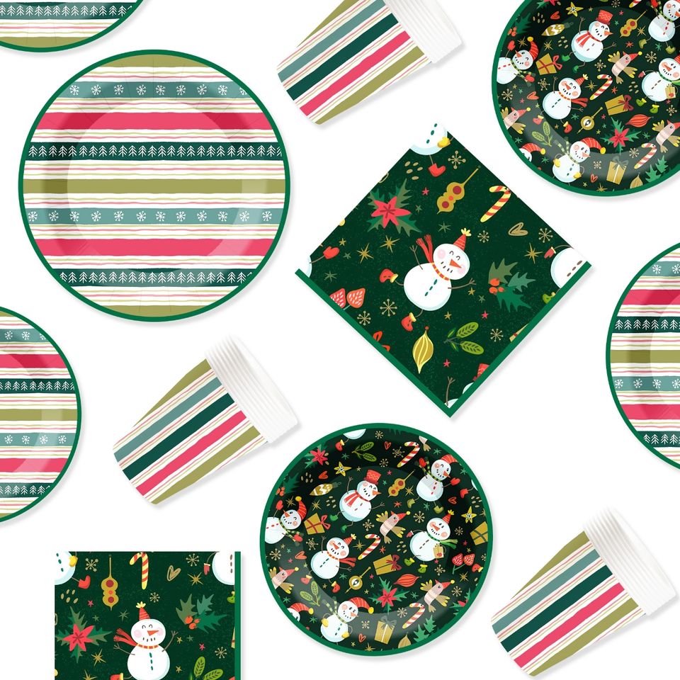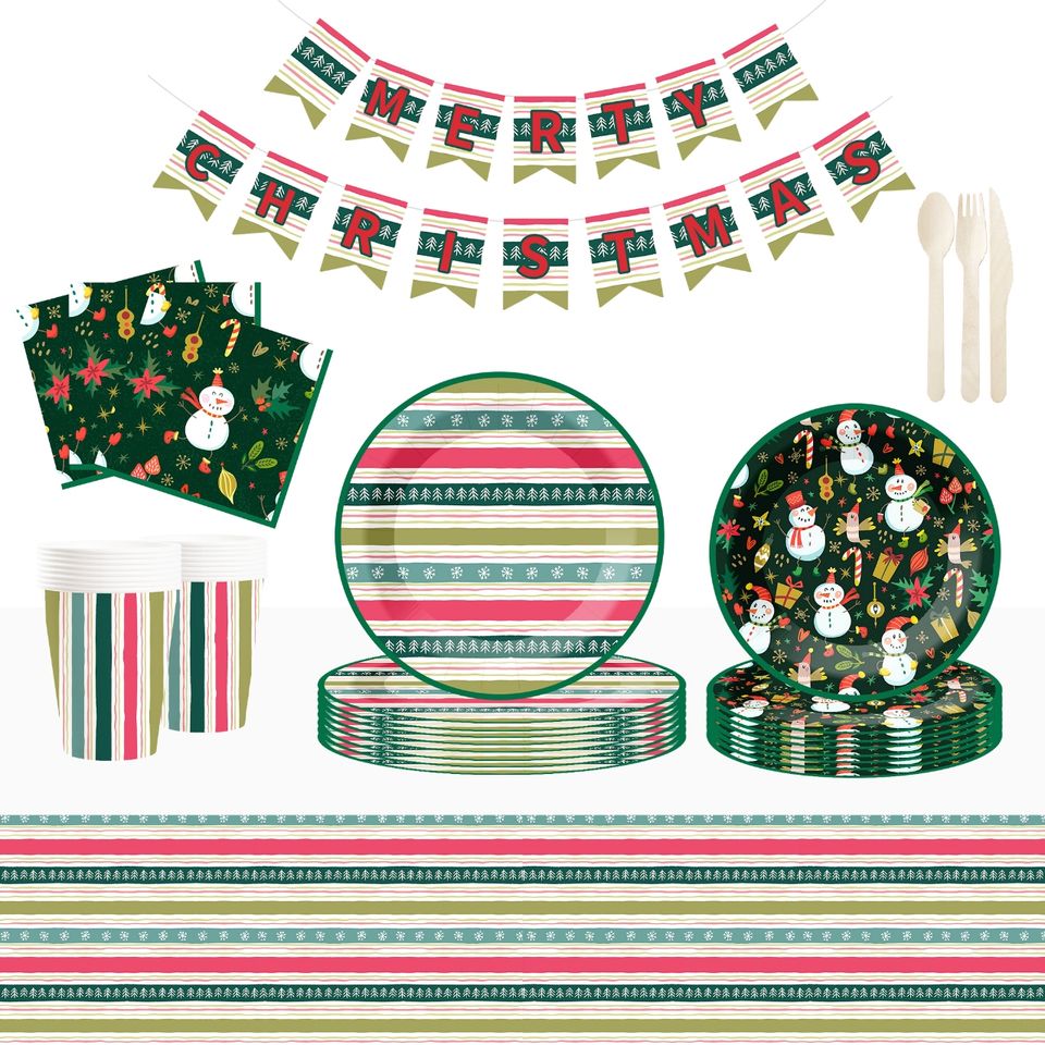Ensemble de vaisselle de fête personnalisé DAMAI pour Noël, assiettes, gobelets et serviettes en papier à rayures vertes avec impression de bonhomme de neige jetables