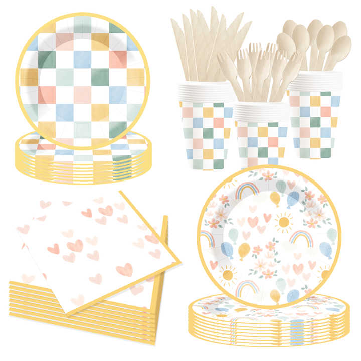 Ensemble de vaisselle sur le thème de l'arc-en-ciel personnalisé DAMAI pour les décorations de fête d'anniversaire des filles, fournitures pour fête d'anniversaire, assiettes en papier à motif de damier