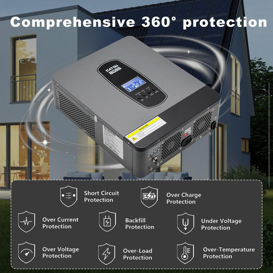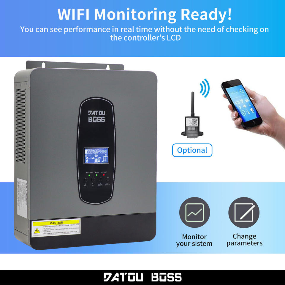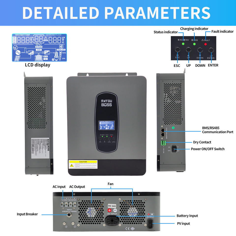 DATOUBOSS Stock UE Onduleurs solaires hybrides 3KW 24V vers 230V pour usage domestique, onduleur hybride solaire à onde sinusoïdale pure, compatible hors réseau et réseau