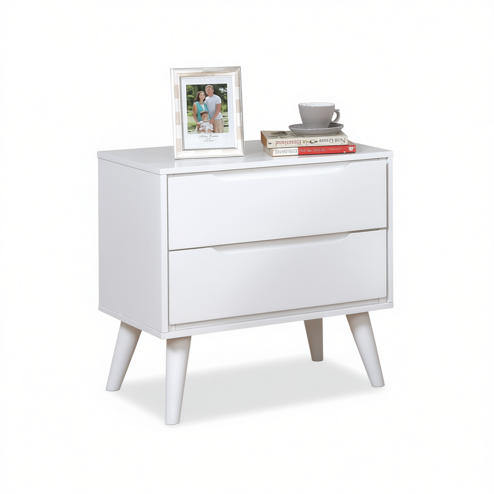 Table de chevet moderne du milieu du siècle, en bois massif blanc, 2 tiroirs, pieds coniques, pour appartement, chambre à coucher