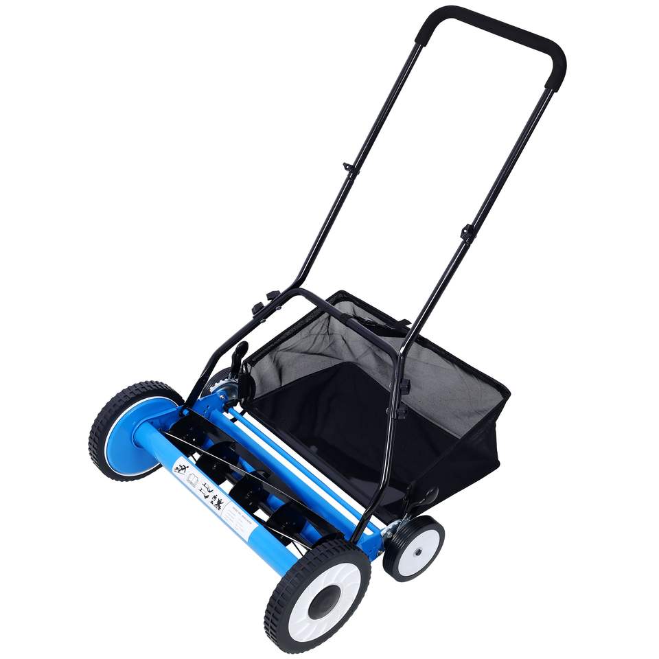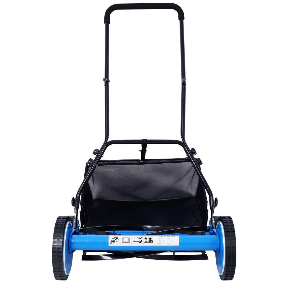 DB Tondeuse à gazon électrique sans fil de 20 pouces avec 5 lames et design bleu à 4 roues et attrape-herbe pour la coupe