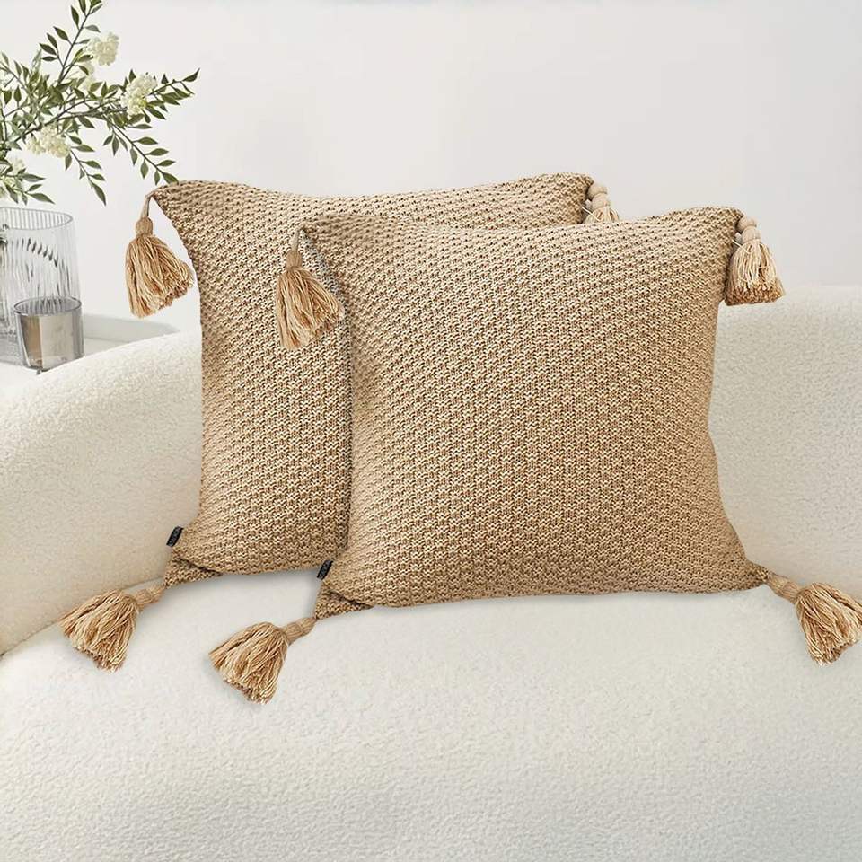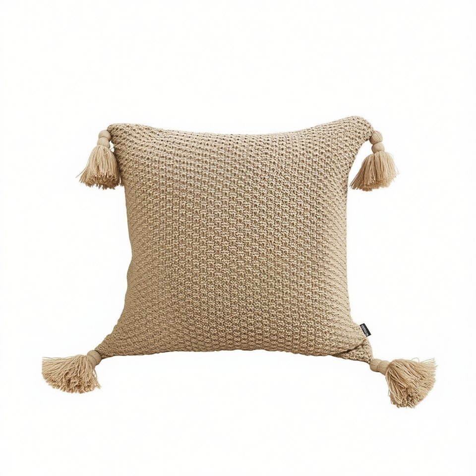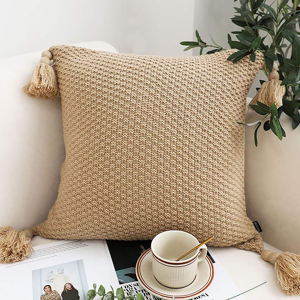 Housse de coussin en laine DB, 50 cm carré, tricotée avec des accents de pompons, coussin décoratif de style transitionnel, brun clair