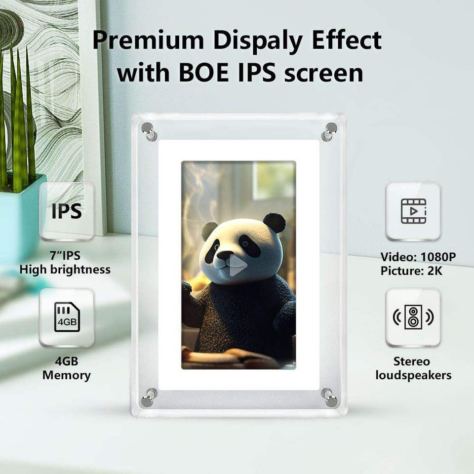 Cadre photo numérique Dragon Touch 7 pouces, écran IPS, cadre en acrylique, rotation automatique, lecture MP4, USB, mémoire 2 Go, batterie 1500 mAh