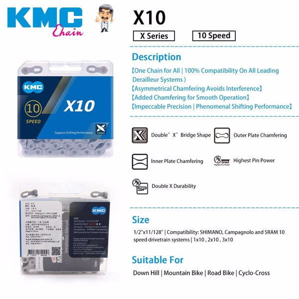 Chaîne de vélo KMC X10 10 vitesses VTT en acier, performances de passage de vitesses supérieures, 116 maillons, emballage en boîte plastique