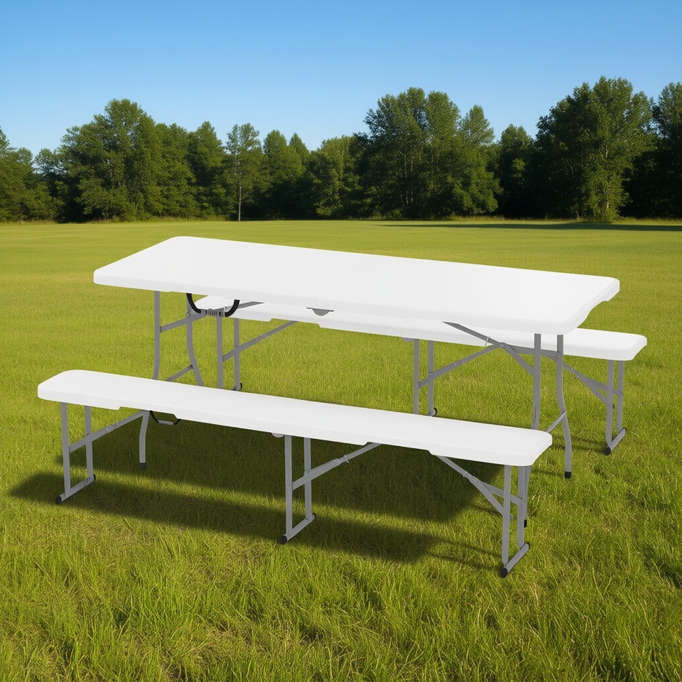 Table de pique-nique pliante portable avec bancs, 1,8 m, cadre en aluminium et plastique blanc, pour camping, salle de sport, barbecue, utilisation extérieure, design à chevrons