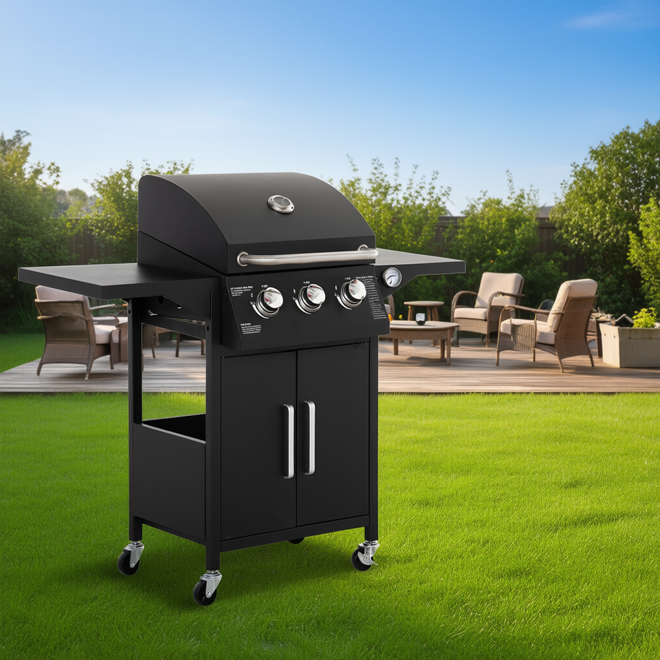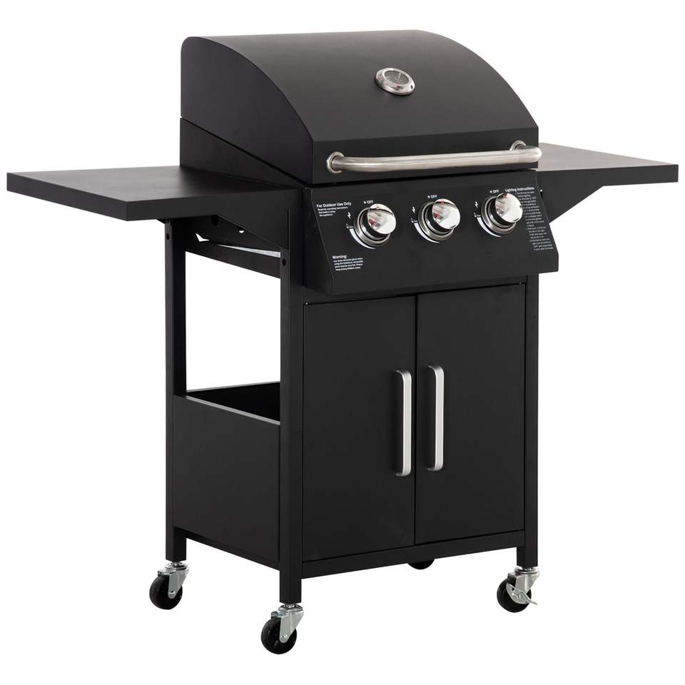 Barbecue à gaz portable 3 brûleurs avec grille de maintien au chaud et armoire, pour 5 personnes, modèle noir, style moderne, commande par bouton